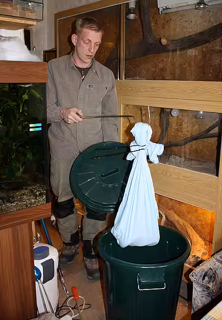 Die kleine, unordentliche Wohnung des Verstorbenen war mit einem großen Aquarium und zahlreichen Terrarien in unterschiedlichen Größen vollgestellt. Die sechs Giftschlangen lagen in ihren Glaskästen – aber für welche Tiere waren die übrigen Behältnisse? Die Angehörigen erzählten, dass auch noch insgesamt 60 Skorpione und Vogelspinnen sowie eine ebenfalls mit Giftdrüsen ausgestattete Krustenechse in der Wohnung gelebt hatten. Diese Tiere hatte die Nichte des Halters jedoch bereits vermittelt. Das Faible des Halters für Gifttiere im Kopf, inspizierten wir vorsichtig die Wohnung und schnell war klar, dass sich hier ein stilles Drama abgespielt hatte. Frank B. lebte sehr zurückgezogen und hatte auch niemanden darüber informiert, dass er im Krankenhaus ist, wo er schließlich verstarb. Daher waren die Tiere lange unversorgt geblieben. Wir fanden drei tote und vertrocknete Vogelspinnen in ihren verdreckten Terrarien. Zwei giftige Dickschwanzskorpione waren in ihrem Glaskasten verhungert und verdurstet. Auch die als Futtertiere gehaltenen Mäuse, Heuschrecken und Schaben mussten sterben, da ihnen niemand zu fressen und zu trinken gegeben hatte. Was uns jedoch am meisten beunruhigte waren drei giftige Wüstenskorpione, denen die Flucht gelungen war. Die inzwischen gestorbenen Skorpione lagen auf dem Dach eines Terrariums und in einem Zwischenraum zwischen zwei Behältern.