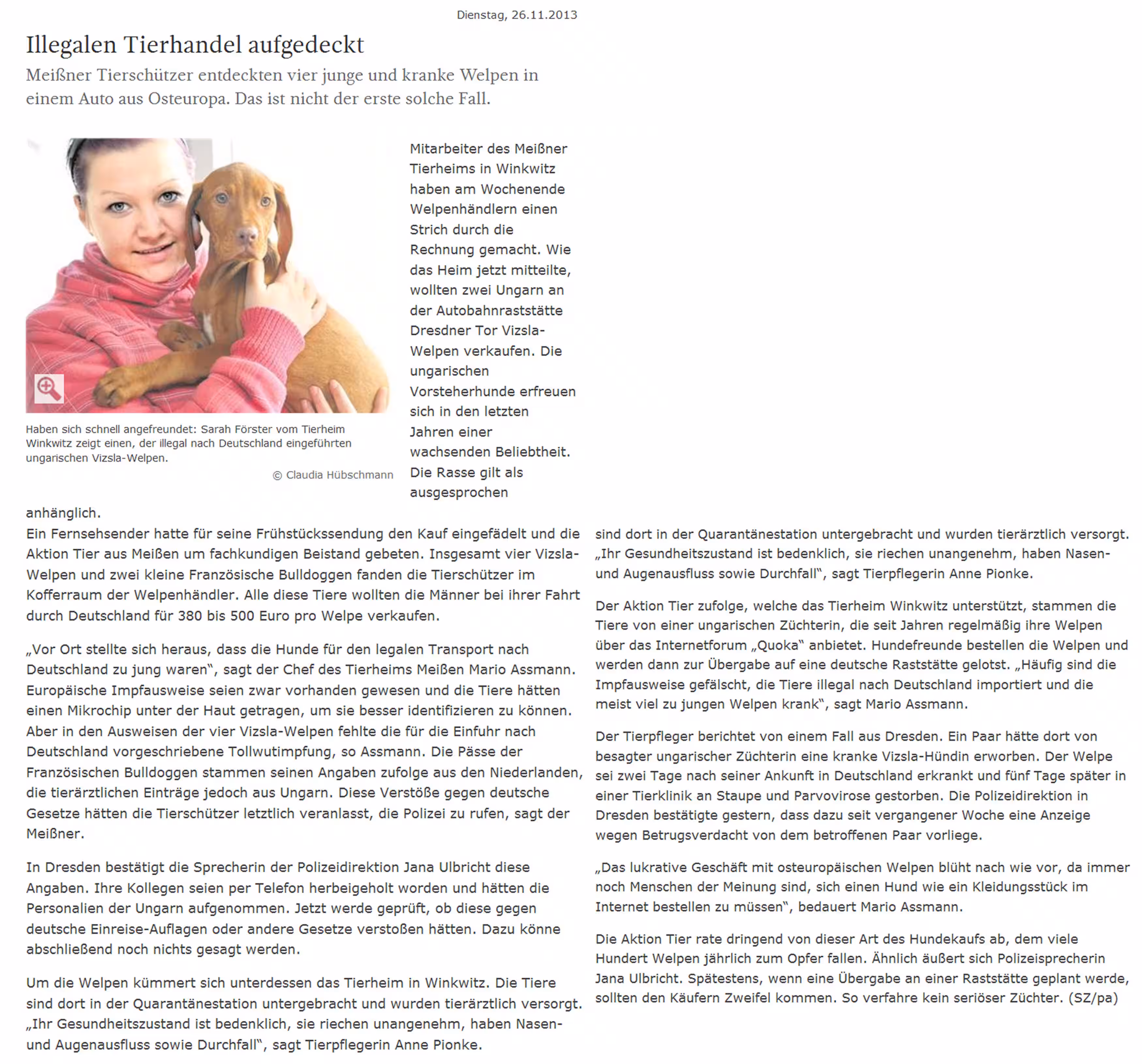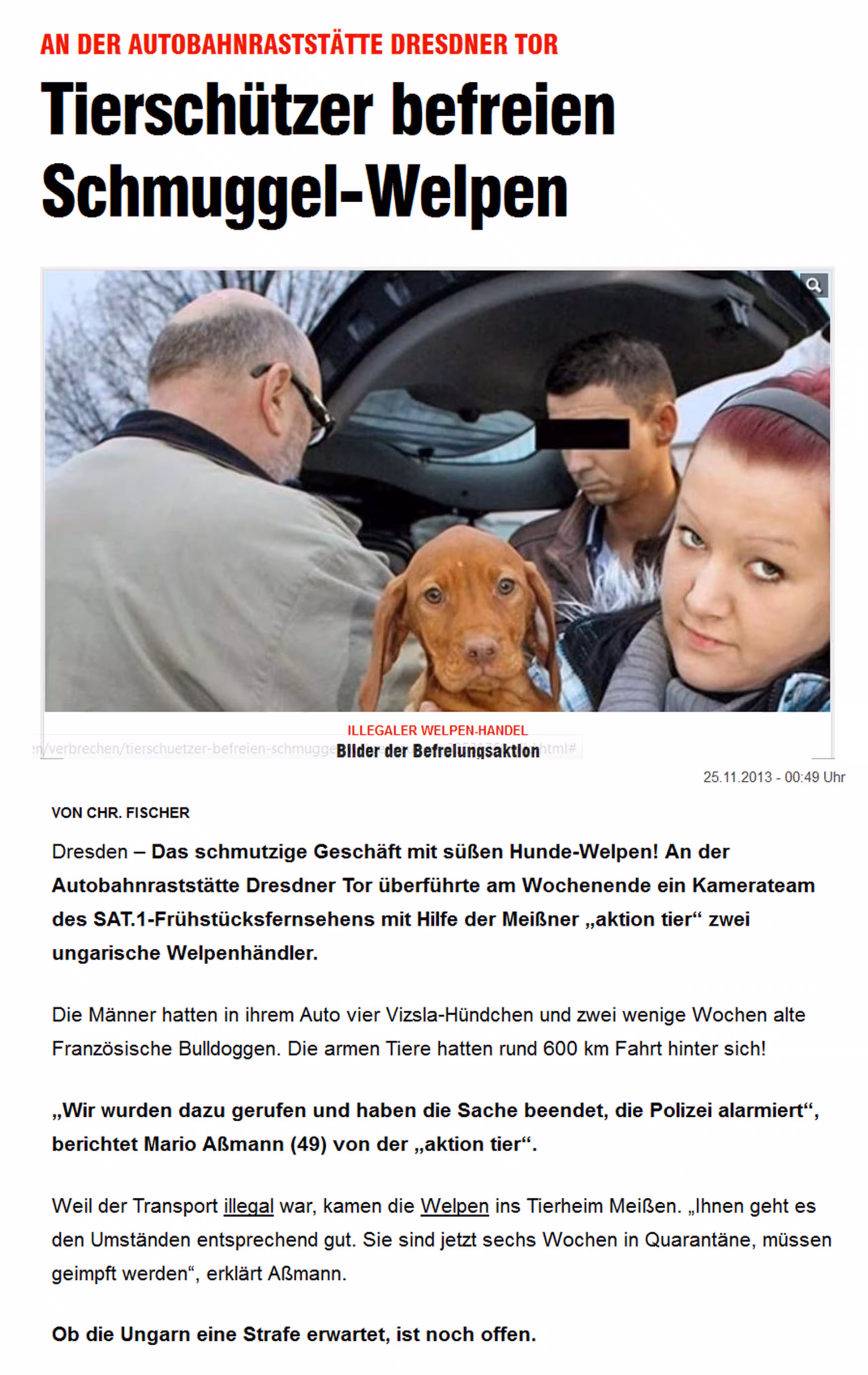 Vergangenen November beispielsweise wollten zwei Männer aus Ungarn an der Autobahnraststätte „Dresdner Tor“ 2 Vizsla-Welpen (Ungarische Vorstehhunde) verkaufen. Ein Fernsehsender hatte den Kauf eingefädelt und aktion tier- Meissen um fachkundigen Bestand gebeten. Weitere 2 Vizsla-Welpen sowie 2 kleine Französische Bulldoggen befanden sich im Kofferraum der Welpenhändler. Auch diese Tiere wollten die Männer bei ihrer Fahrt durch Deutschland für 380-500 Euro pro Welpe verkaufen.